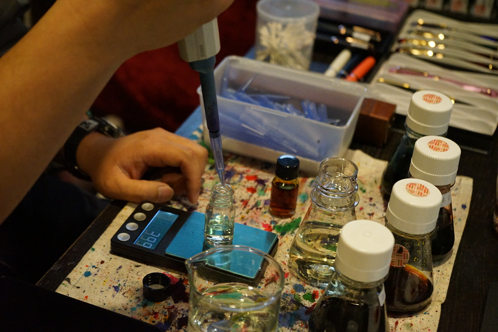 川崎さんがこれまで作ってきたオリジナルインクは、1000を超えます。今回のツアーは、ガラスペンや万年筆の特徴や、書き心地、長く使うためのお手入れ方法を聞いた後、自分の好きな色を組み合わせて、一期一会のオリジナルインクづくりに挑戦。自分の好みに合った色を探求して「インク沼」と手書きの世界を楽しみましょう!
