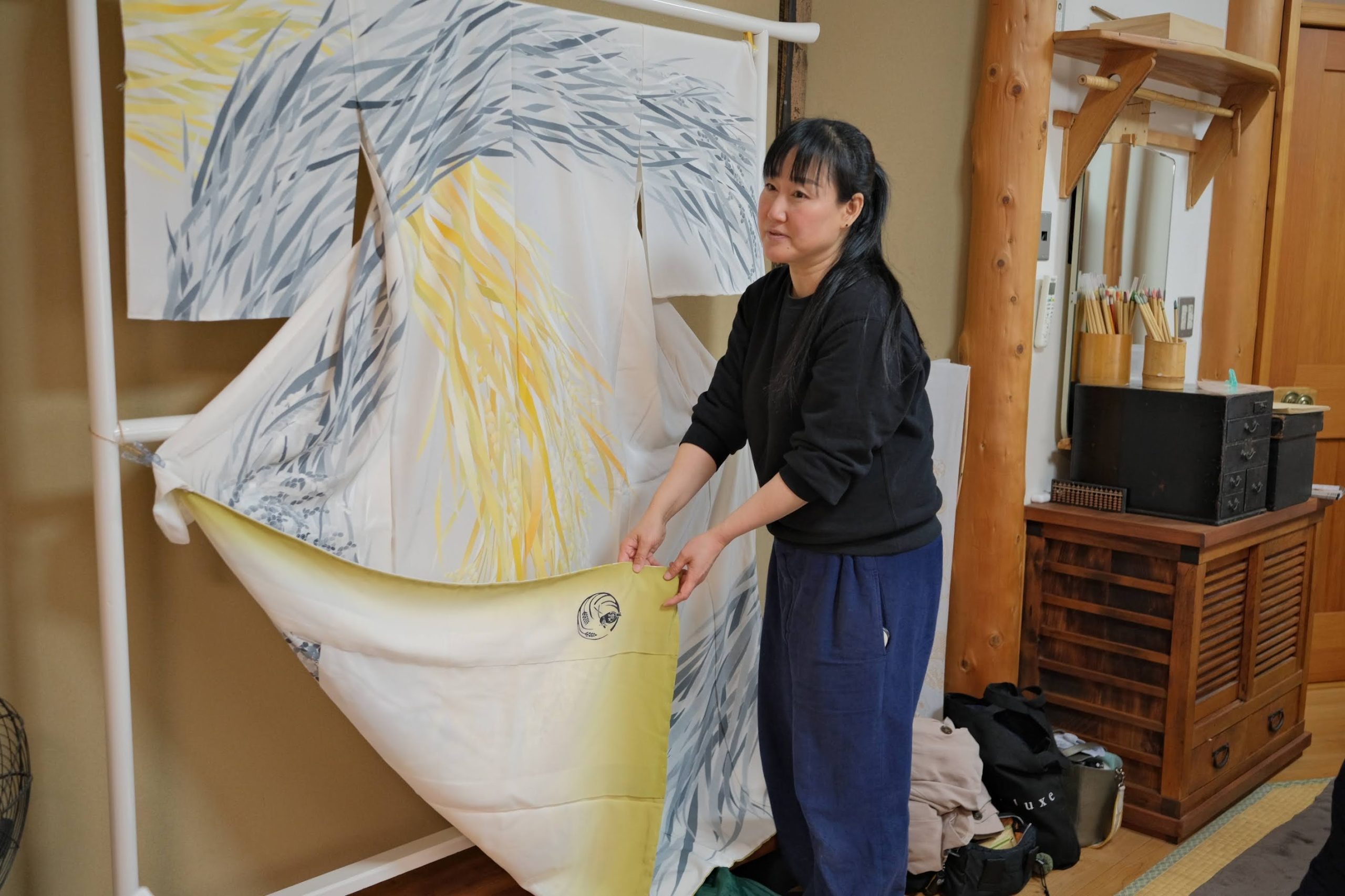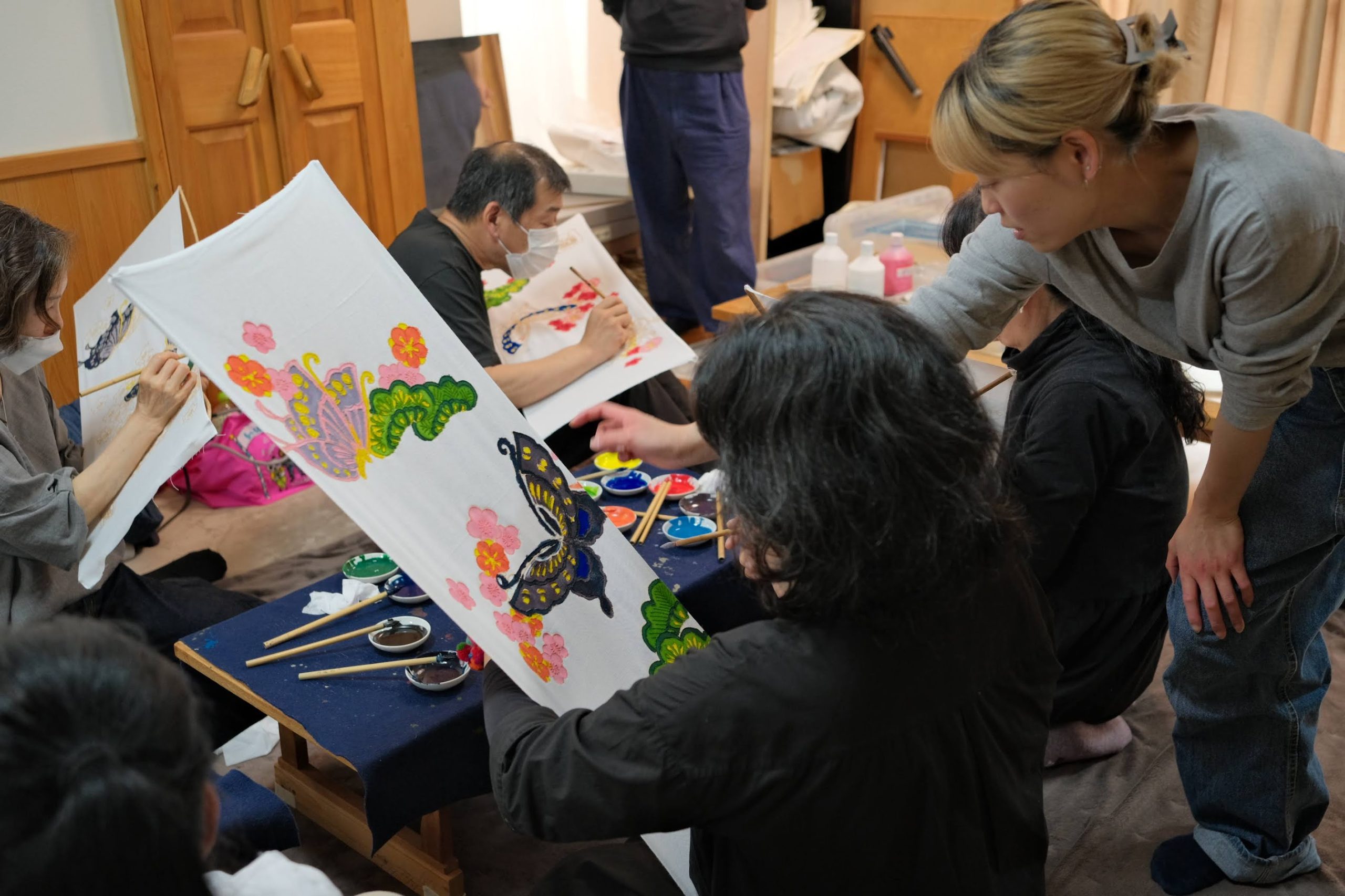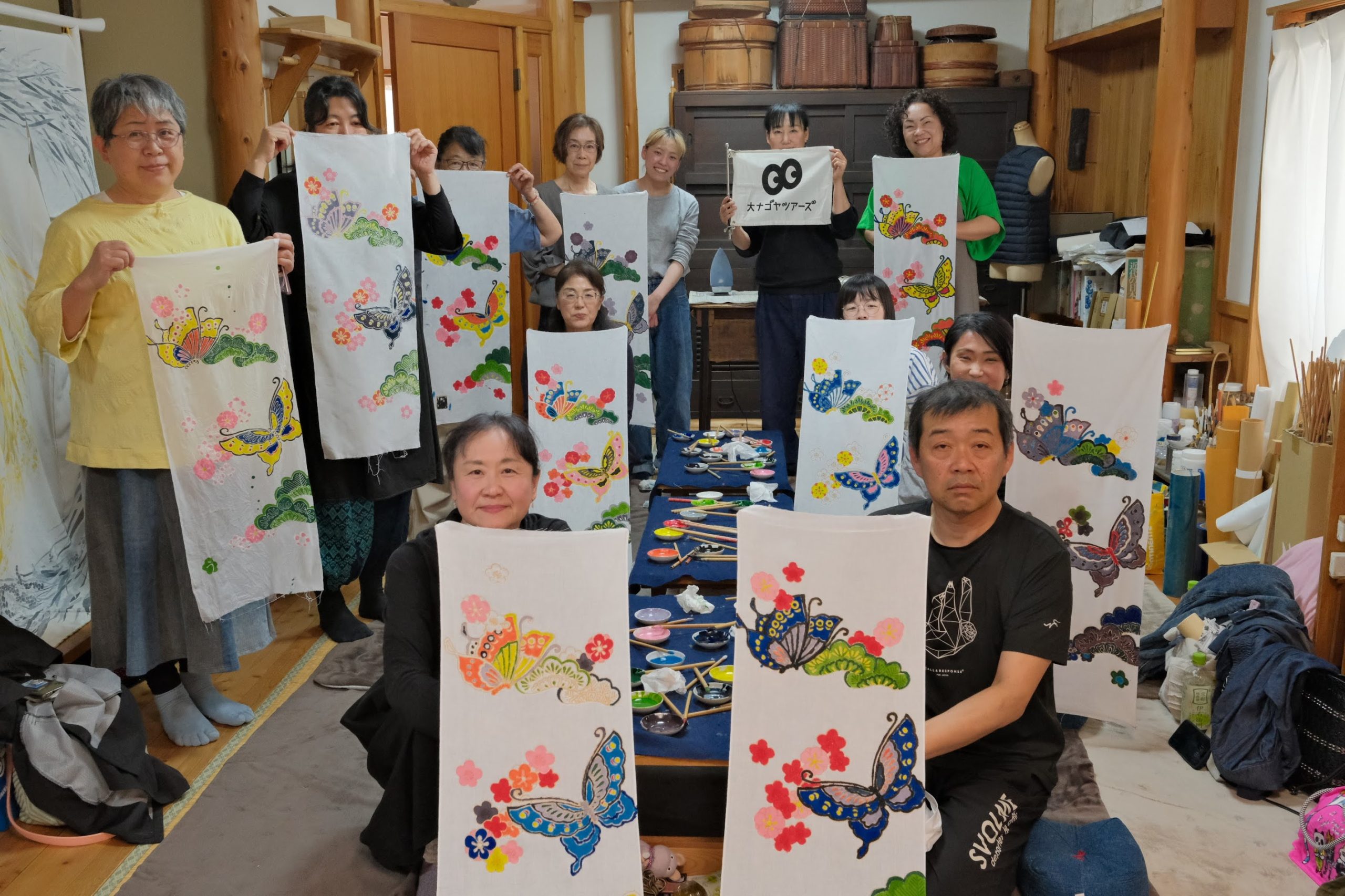 華やかな尾張文化のもと、堅実な土地柄と気風のため、模様の配色は色数を控え、一つの色の濃淡で絵柄を描く渋さが特徴的な名古屋友禅という伝統工芸。今回は伝統工芸士としての職人であり友禅による新しい表現を求める作家でもある櫻井さんと共に、名古屋友禅の手仕事の現場を見学させていただき、女性伝統工芸士に指導を受けながら染めの面白さを知ってもらうためにオリジナルの手ぬぐい染めを体験していただきます。