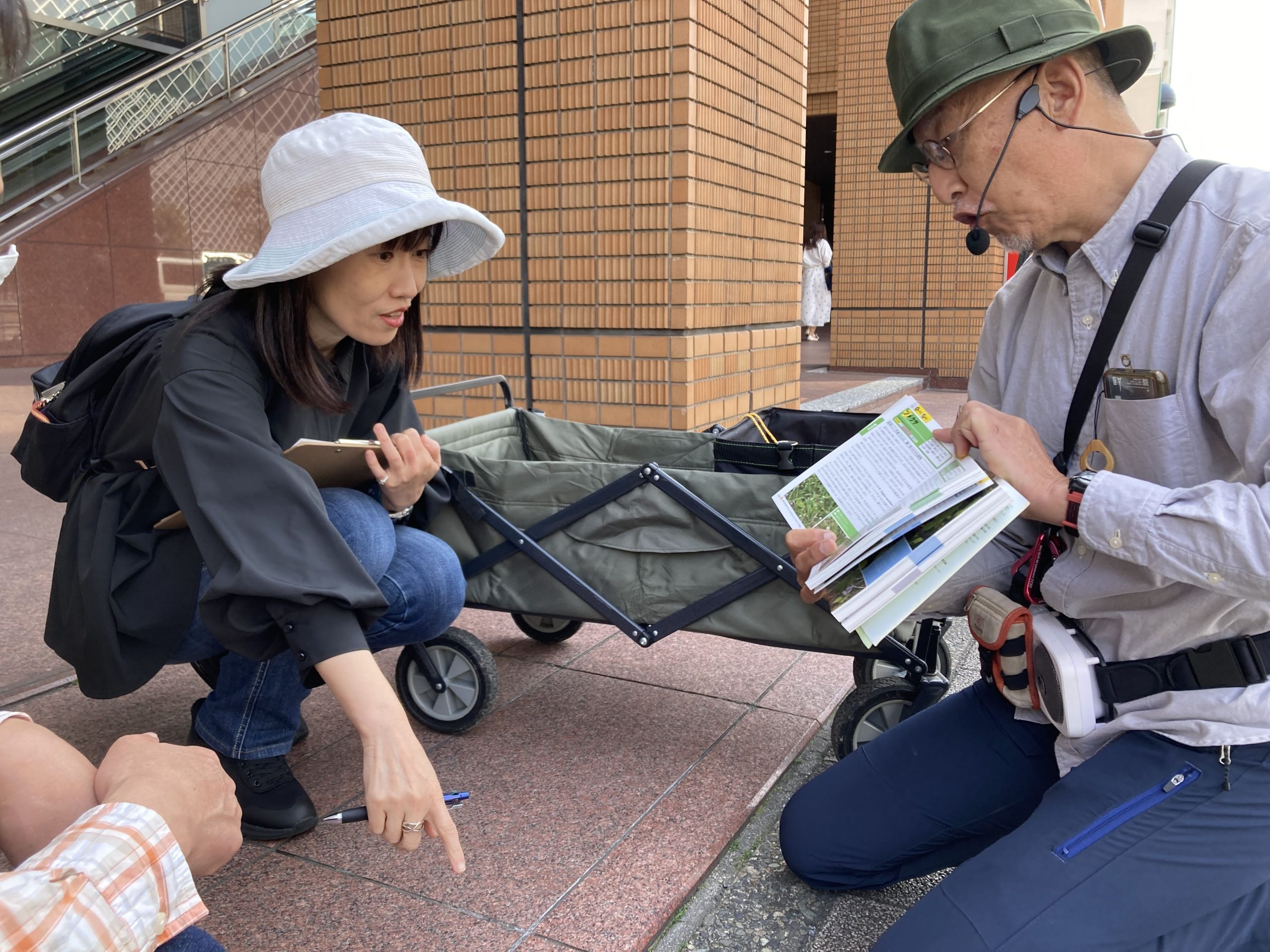 観察用のワークシートや道具などを使って実際に体験しながらのまち歩きです。